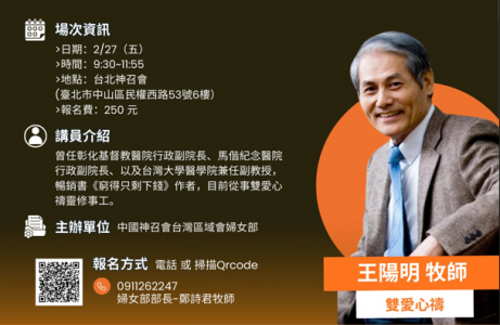 北區牧者同工平安: 婦女部北區聯誼聚會將在年後2/27舉行「健康心靈,幸福人生」講座, 講員是王陽明牧師 敬請教會牧者推動